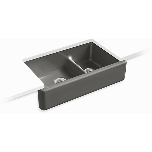 Specification Sheet - The Whitehaven apron-front kitchen sink features a streamlined and versatile farmhouse style to complement any decor. The Self-Trimming design requires only a simple rough cut, overlapping the cabinet face for beautiful results. The sink is designed to fit in most standard 36-inch apron-front cabinetry. A low barrier divides the two compartments, making it easy to wash and rinse large items while still keeping the two basins separate. Crafted from enameled cast iron, this sink resists chipping, cracking, or burning for years of beauty and reliable performance.