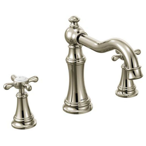 Specification Sheet - Elegant Traditional Design Details and Distinctive Finishing Touches Present a Sense of Uncommon Luxury in the Weymouth Collection; Distinctive Accents Include Porcelain Inlays that Feature Euro-Influenced Decorative Script and Signature Styling Elements to Make an Extravagant Statement in Your Traditional Bath; Polished Nickel Finish Provides a Mirror-Like Warm Metallic Look Adding a Refined touch to Your Space; Two-Handle Cross Handles; Built on the Moen M-Pact Common Valve System Allowing you to Update the Faucet Style in the Future with Out Replacing any Plumbing; Lifetime Limited Warranty