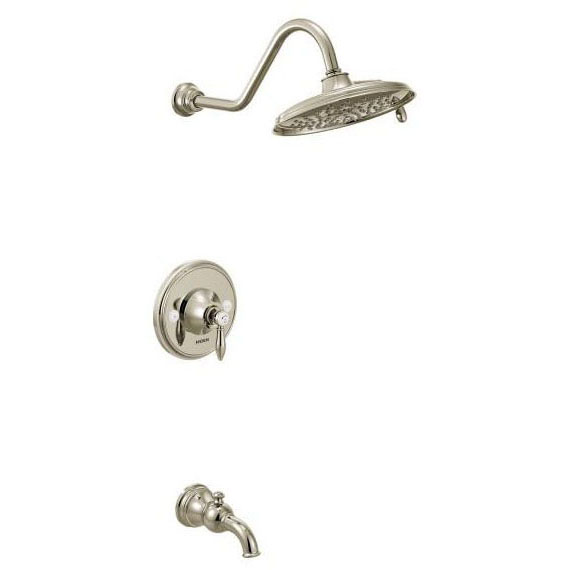 Specification Sheet - Elegant, Traditional Design Details and Distinctive Finishing Touches Present a Sense of Uncommon Luxury in the Weymouth Collection; Distinctive Accents Include Porcelain Inlays that Feature Euro Influenced Decorative Script and Signature Styling Elements to Make an Extravagant Statement in Your Traditional Bath; Polished Nickel Finish Provides a Mirror Like Warm Metallic Look, Adding a Refined Touch to Your Space; Lever Handles Make it Easy to Adjust the Water; Equipped with the PosiTemp Pressure Balancing Control Valve to Help Maintain Water Temperature in the Shower; Concentrated Rinse; Full Spray; Advanced, Self Pressurizing Moen Immersion Rainshower Technology Channels Water Through the Showerhead with Three Times More Spray Power than Most Rainshowers for a More Thorough Rinse; Built on the Moen M Pact Common Valve System, Allowing you to Update the Faucet Style in the Future Without Replacing any Plumbing; Lifetime Limited Warranty