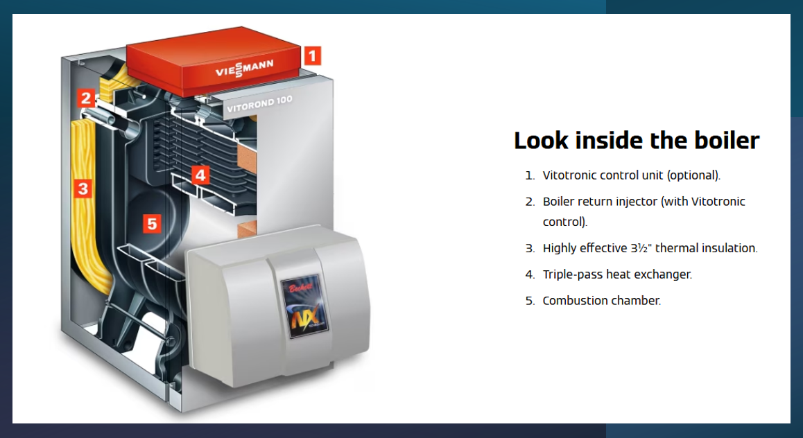 - Quiet operation with Beckett or Riello burner